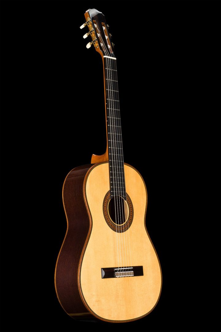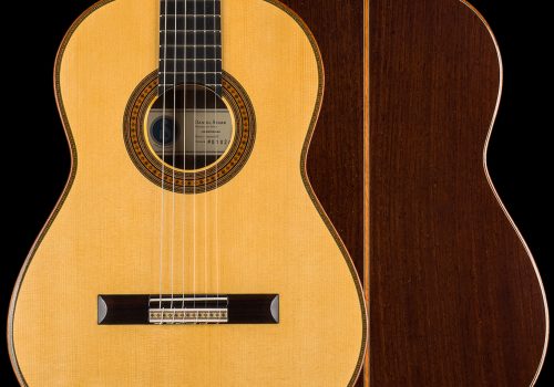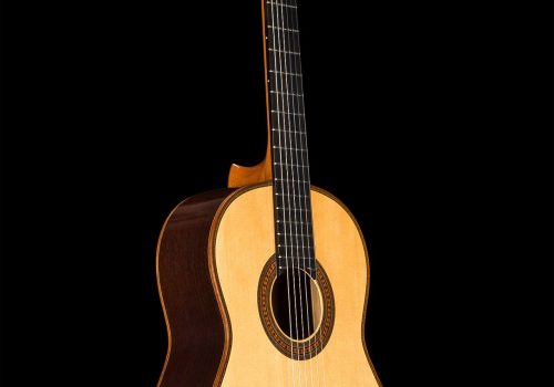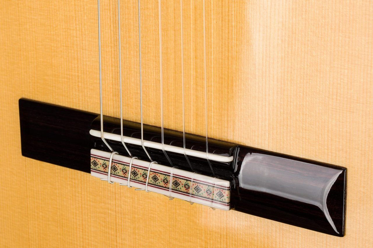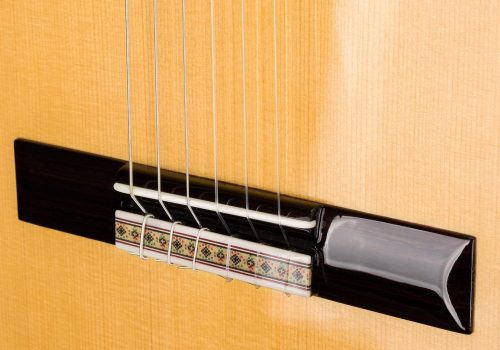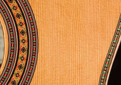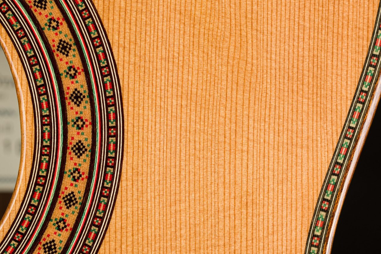 Die Española II weist schon viele Merkmale einer Meistergitarre auf. Zum Beispiel eine aufwendig handgefertigte Mosaikrosette und Knüpfblock nach Simplicio, eine nach meinen Vorgaben ausgearbeitete Fächerbeleistung, vollmassive selektierte Hölzer und eine individuelle Korrektur der Intonation (G-Saite).