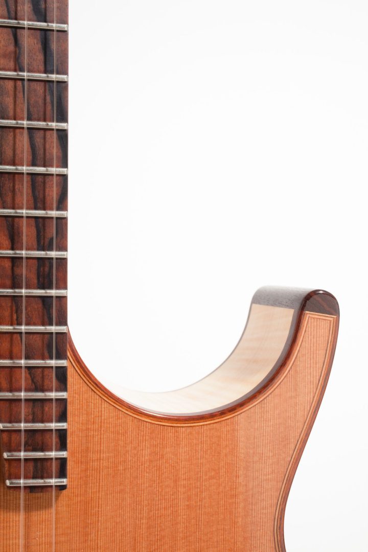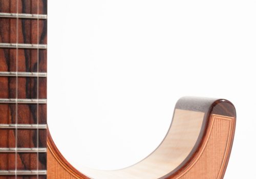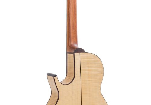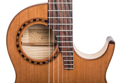 2007/2008 entworfen für den großartigen Zaza (ZZ) Miminoshvili der Band The Shin ist sie inzwischen einer ganzen Reihe von Profi-Musikern ans Herz gewachsen. Der tief geschnittene Cutaway und das 24 Bünde fassende Griffbrett eröffnen neue spielerische Freiheiten. Das seitliche Schalloch maximiert die akustisch nutzbare Deckenfläche und der asymmetrische Kopf (4+2, entworfen mit Alexander Kilian 2010) komplettiert den avantgardistischen Look.
