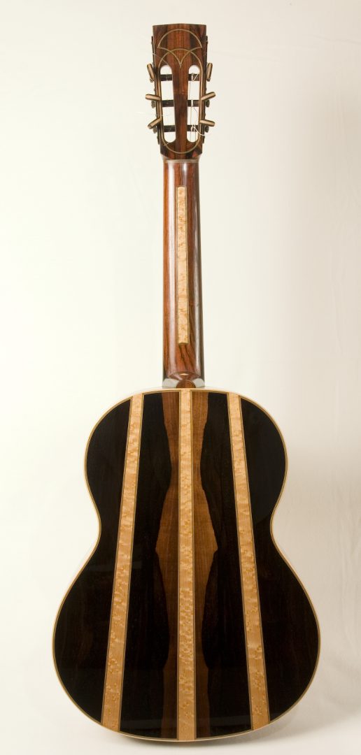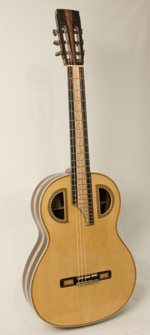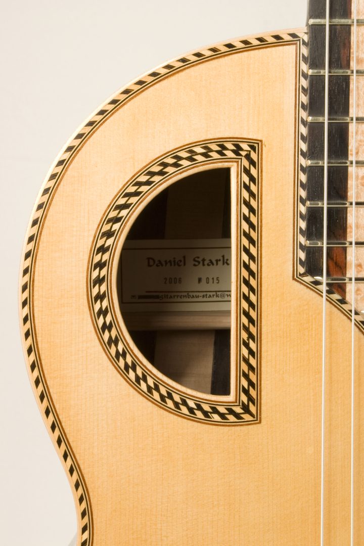 Das abgebildete Instrument ist 2006 im Rahmen meiner Diplomarbeit entstanden, sicher das Aufwendigste und Verzierteste von mir gebaute Instrument. Zusätzlich mit einer versteifenden Holzkonstruktion im Inneren des Korpus ausgestattet, die der Deformation durch den Saitenzug entgegen wirkt. Diese Entspannung des Korpus plus Massezugabe bewirkt einen sehr satten und lange klingenden Ton, erinnernd an ein Klavier.